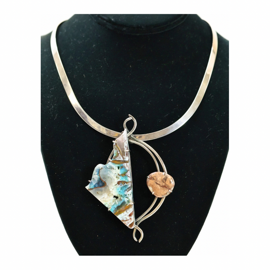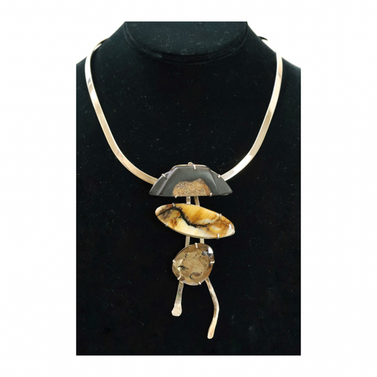 In early 2021, as the pandemic began to lessen, I embarked on a journey to strengthen and bolster my silver smithing techniques through professional studies. I began to employ newly refined, innovative design elements. Constructing open backplates instead of solid ones, creating air space around the focal stone or fossil feature, utilizing various iron settings, Sterling bars, shapes, circles, and geometrics; purposely creating "breathing" room for the stones and lighter physical weight for the wearer.