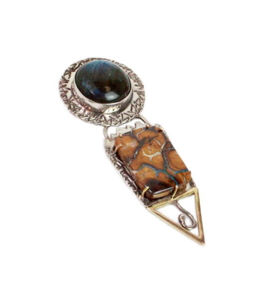 I create one of a kind and limited production jewelry and small scale sculpture with wearable elements .My materials are sterling and fine silver, karat golds and unusual stones some of which I cut myself. The techniques that I employ are fabrication, stamping, fusing, forging, stone setting, and limited casting. Many of my pieces can be worn different ways such as earrings that have detachable parts, pin and pendant combinations and sculptures with jewelry elements hidden within them.