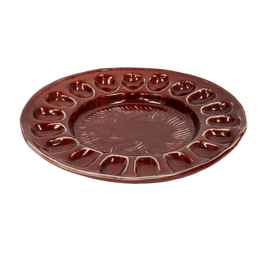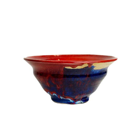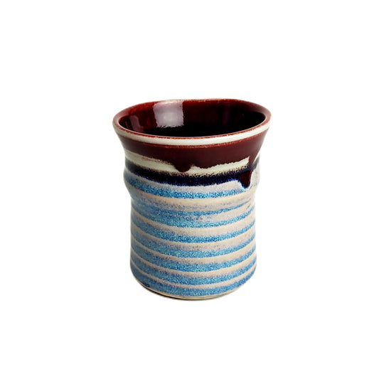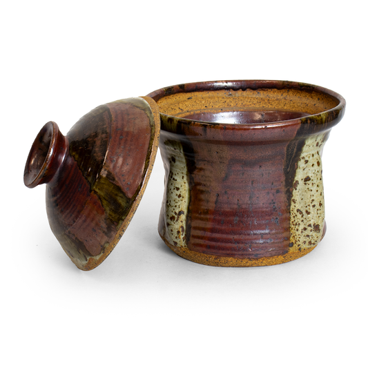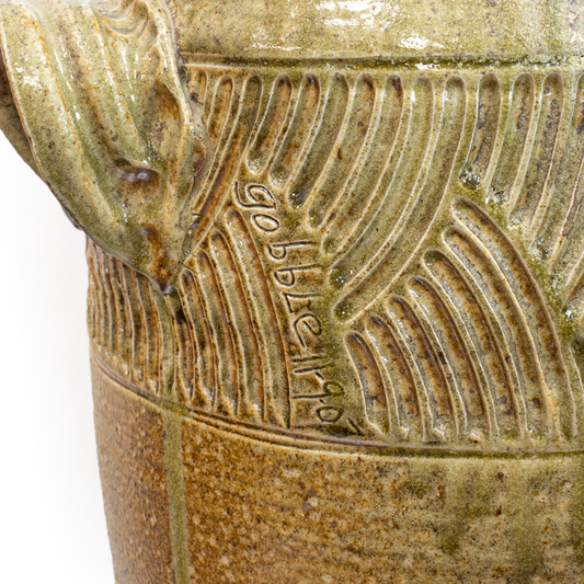 Clyde Gobble’s deep attention to detail and his perfect marriage of beautiful design, workmanship and utility mark each piece that bears his signature. Clyde describes his own work as “mostly functional things, that are meant to be used—to live with, to cook with, to eat and drink out of, not put up on a shelf to look at.” He is possibly best known for his carved brown “Abbots Creek” pieces with trademark mushroom handles, earth-toned “Blue Ridge” and vivid “High Rock Red”. After nearly 4 decades of making thousands of pots, , the simple act of throwing and forming the clay with his hands is still magical to him. He always feels best when he is throwing. He says, “The clay as it glides quickly between my fingers has a never ending life of its own.”