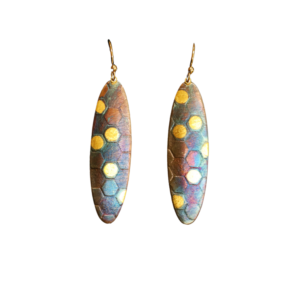 Embossed fine silver, 24kg Keum boo, 18k tubing, 14k fold filled ear wires