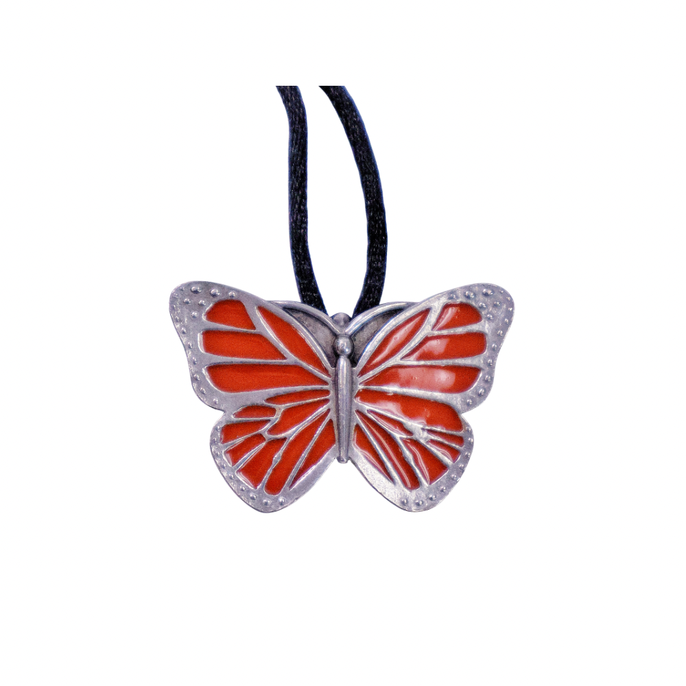 Pewter, orange enamel butterfly pendant handcrafted by Kathleen Doyle and Tom Reardon