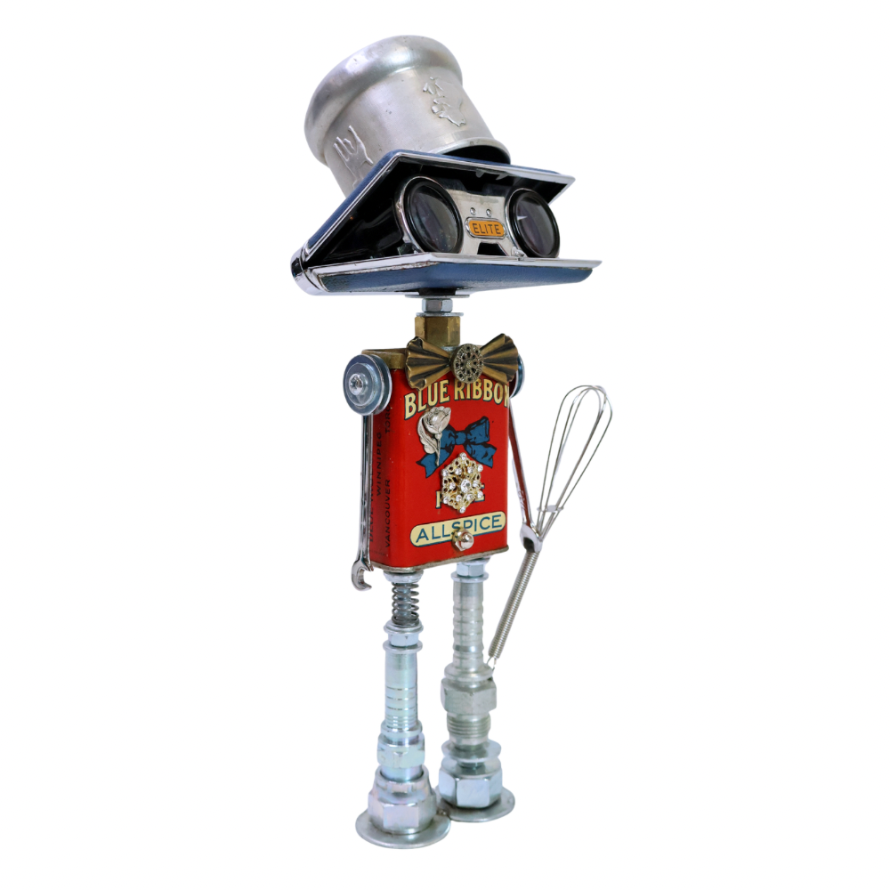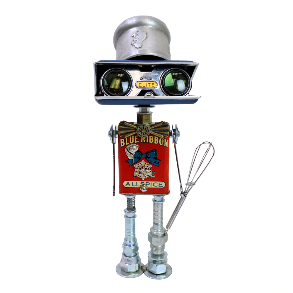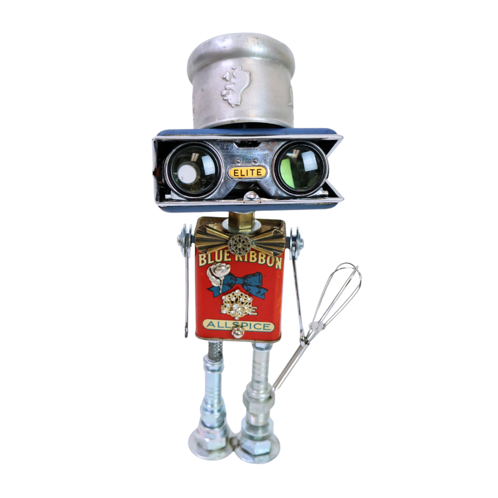 Fobots (Found Object Robots) are the creations of Raleigh, NC artist Amy Flynn. Combing flea markets, auctions, antique malls and the internet for cool, vintage junk, Amy then solders and bolts her finds together to create one-of-a-kind robots. They are not functional, they are not toys, and they will not go on a rampage while you sleep.