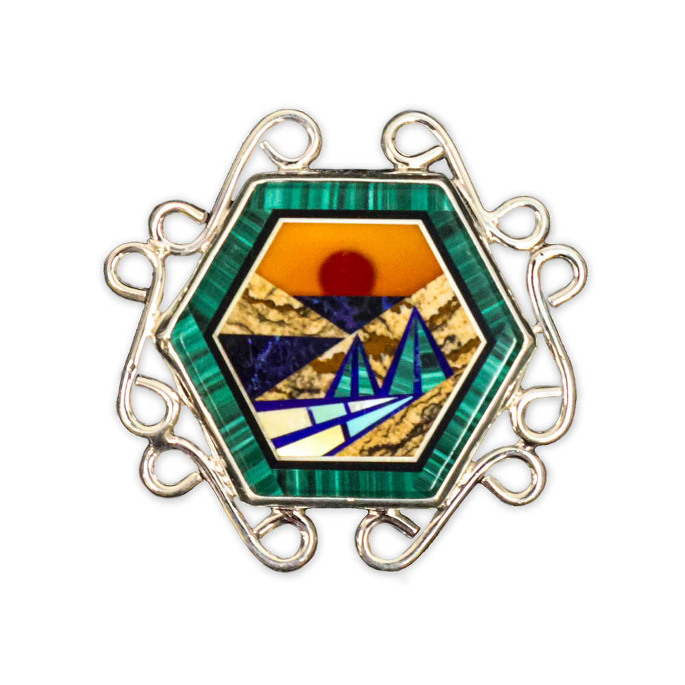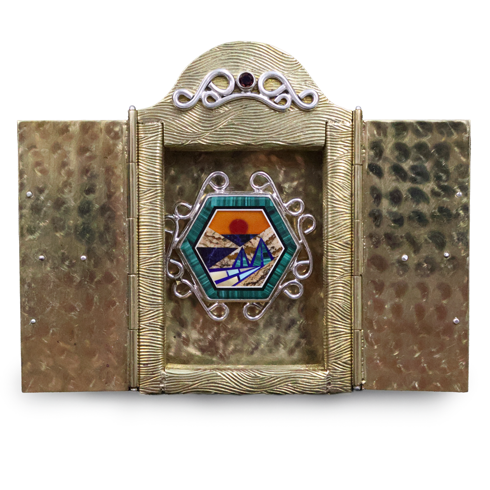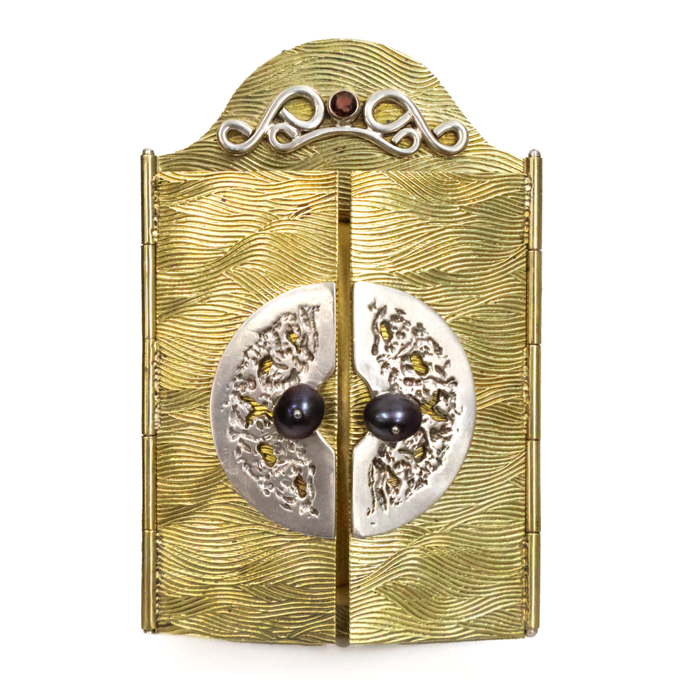 The "Dream Cabinet"- constructed in patterned brass sheet, welded together w/cast sterling silver design panels, forged sterling silver wire motif, accented w/bezel set faceted garnet and pearl "doorknobs". Inside sterling silver pin w/intarsia scene design made up of various stones.