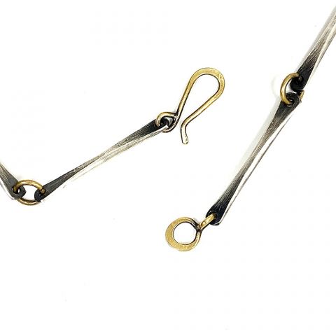 Beautiful blue labrodite sterling and brass pendant by Exhibiting Artist in Jewelry, Una Barrett.