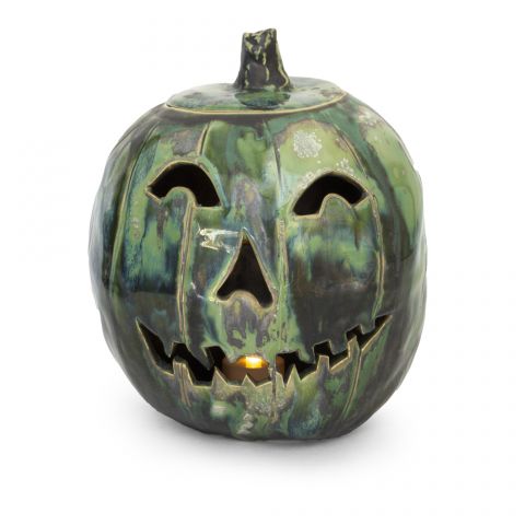 Handcrafted ceramic jack-o-lantern jar with lid by clay artist Douglas Bringle.