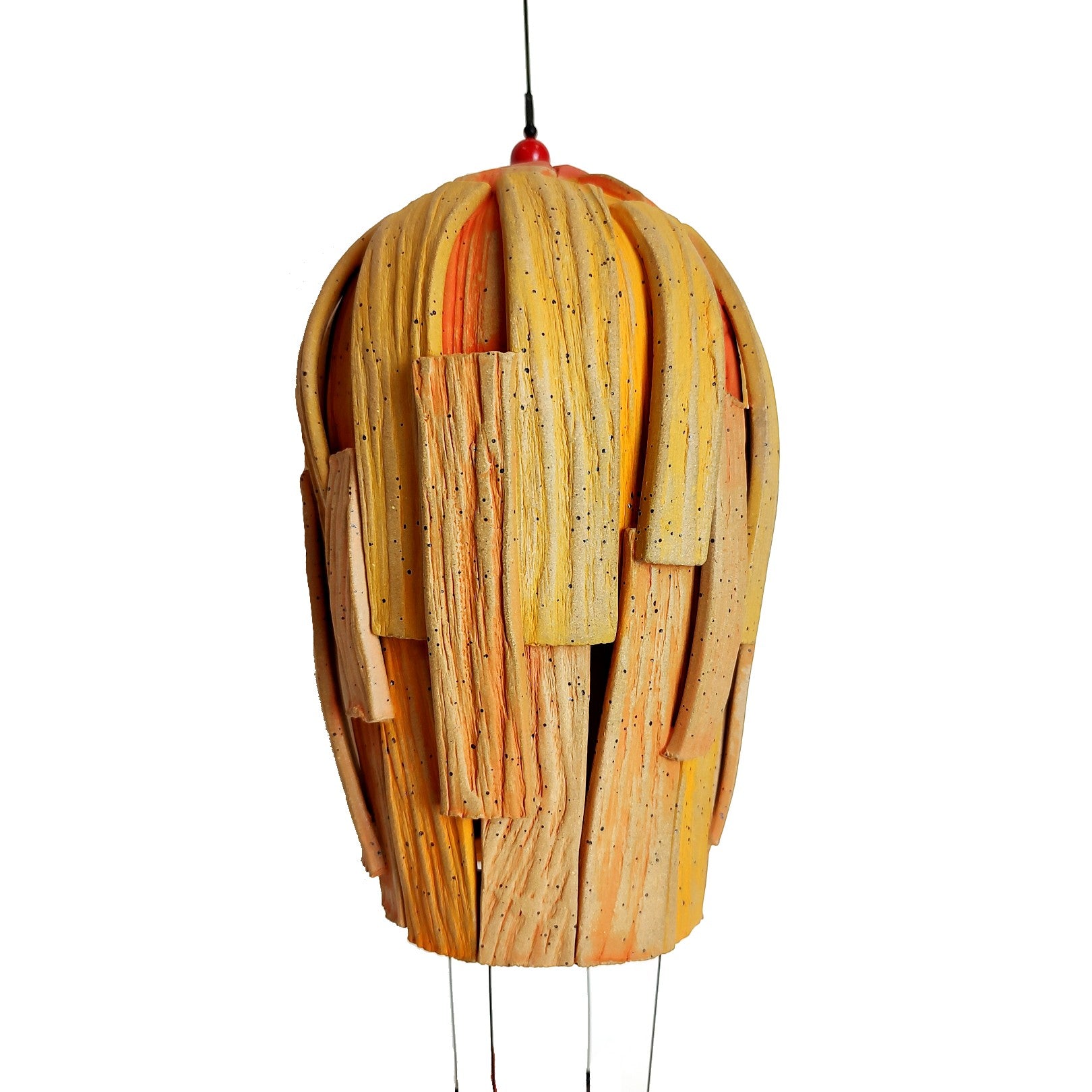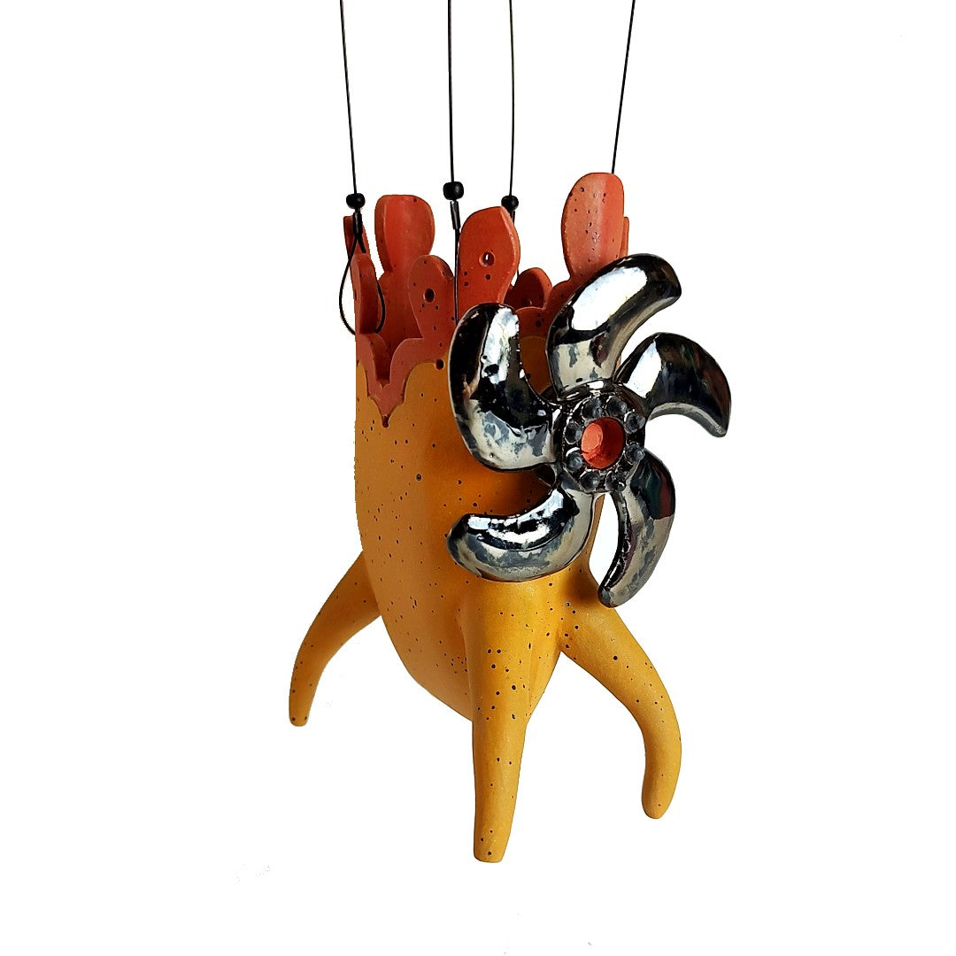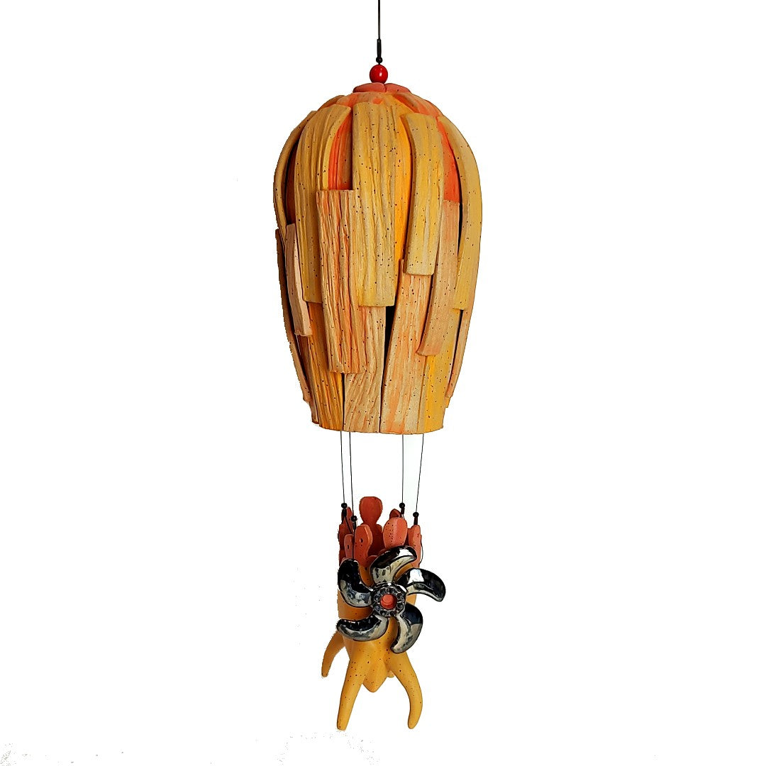 Stoneware clay. Hand-built with yellow/orange underglazes and nailed balloon with hanging motor basket. can hang from ceiling or on the wall.