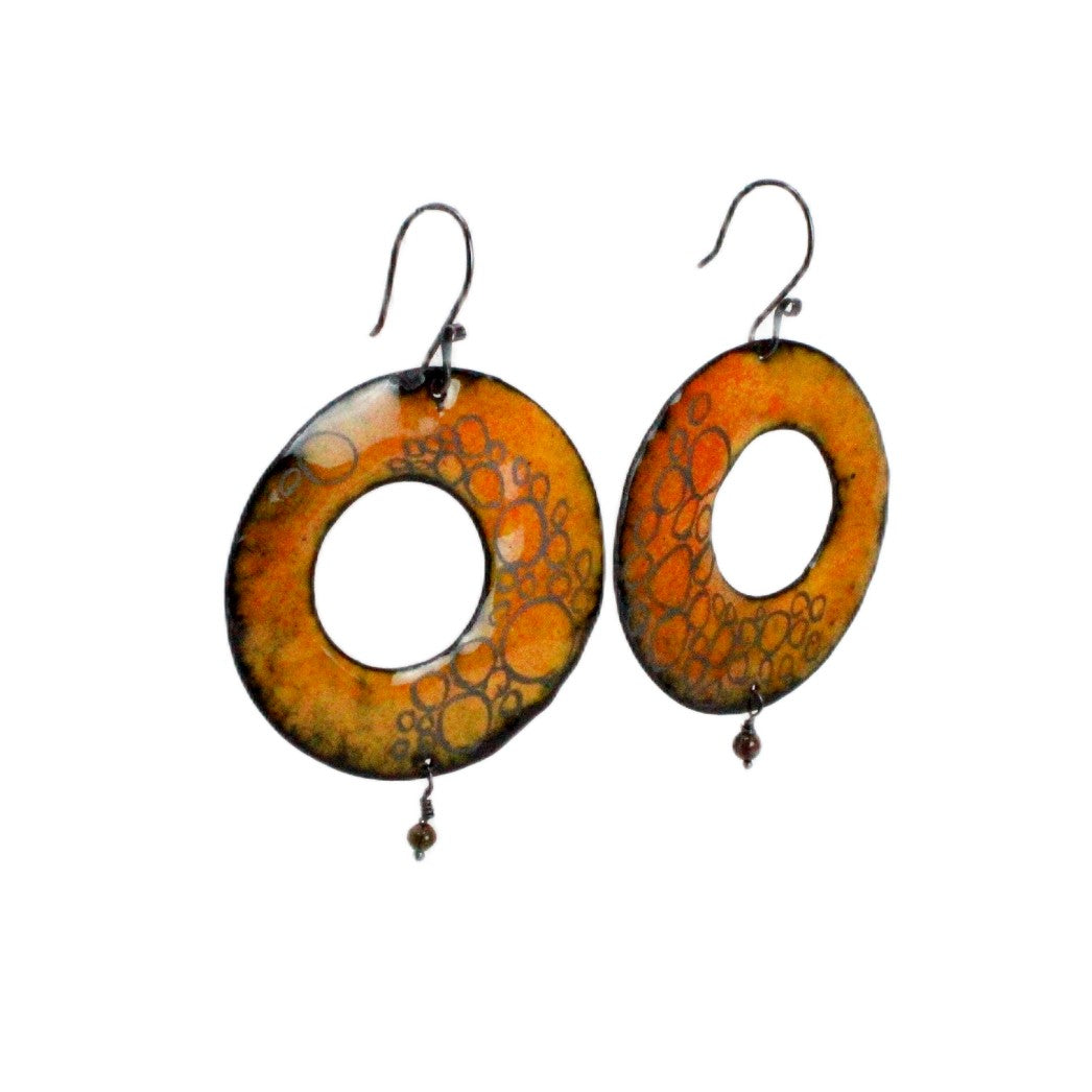 Large round asymmetrical circle enamel earrings handcrafted by Exhibiting Artist in Jewelry, Lisa LeMair.