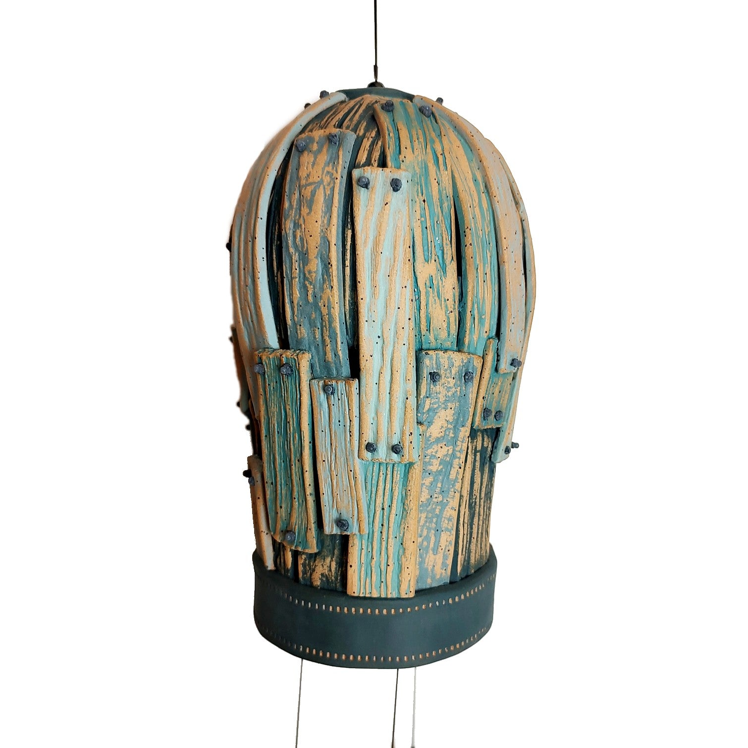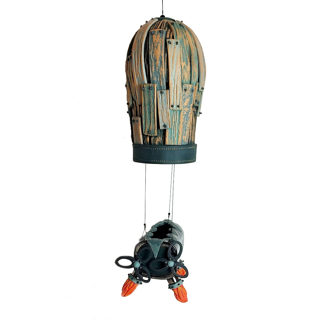 Stoneware clay, hand-built balloon with motor basket and blue underglazes.