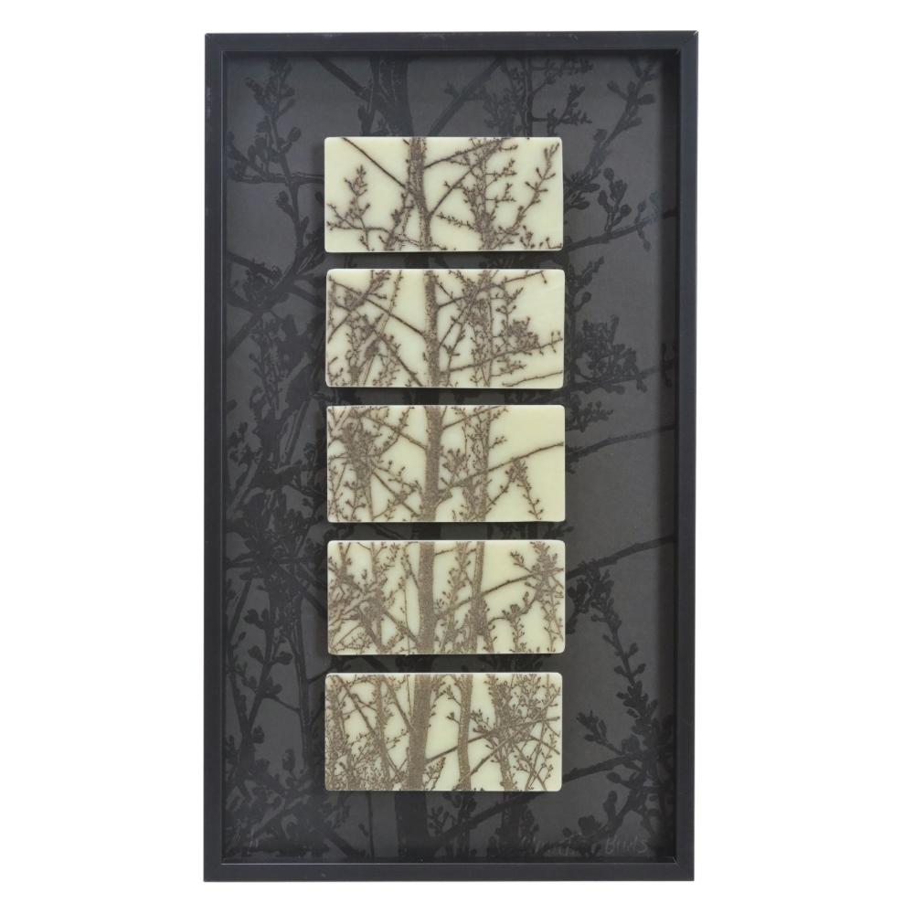 "Plum Tree Buds" Framed powder print on glass by artist Kimberly Adams. 8" x 14"