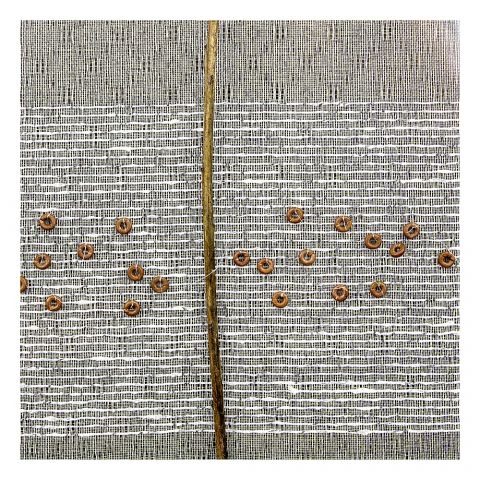 Handcrafted wall piece by fiber artist Vicki Essig. Handwoven silk, brass, kozo paper, and copper beads.