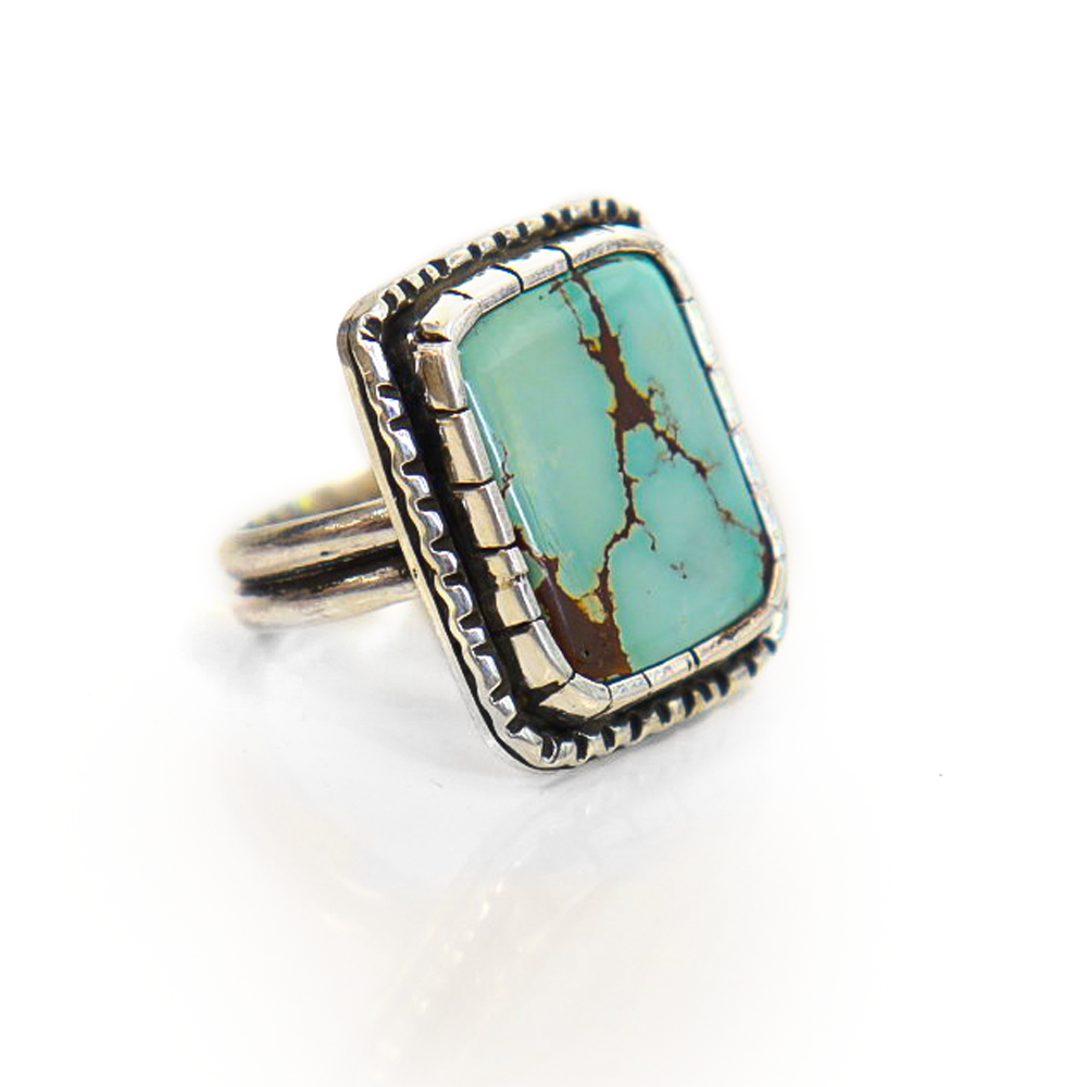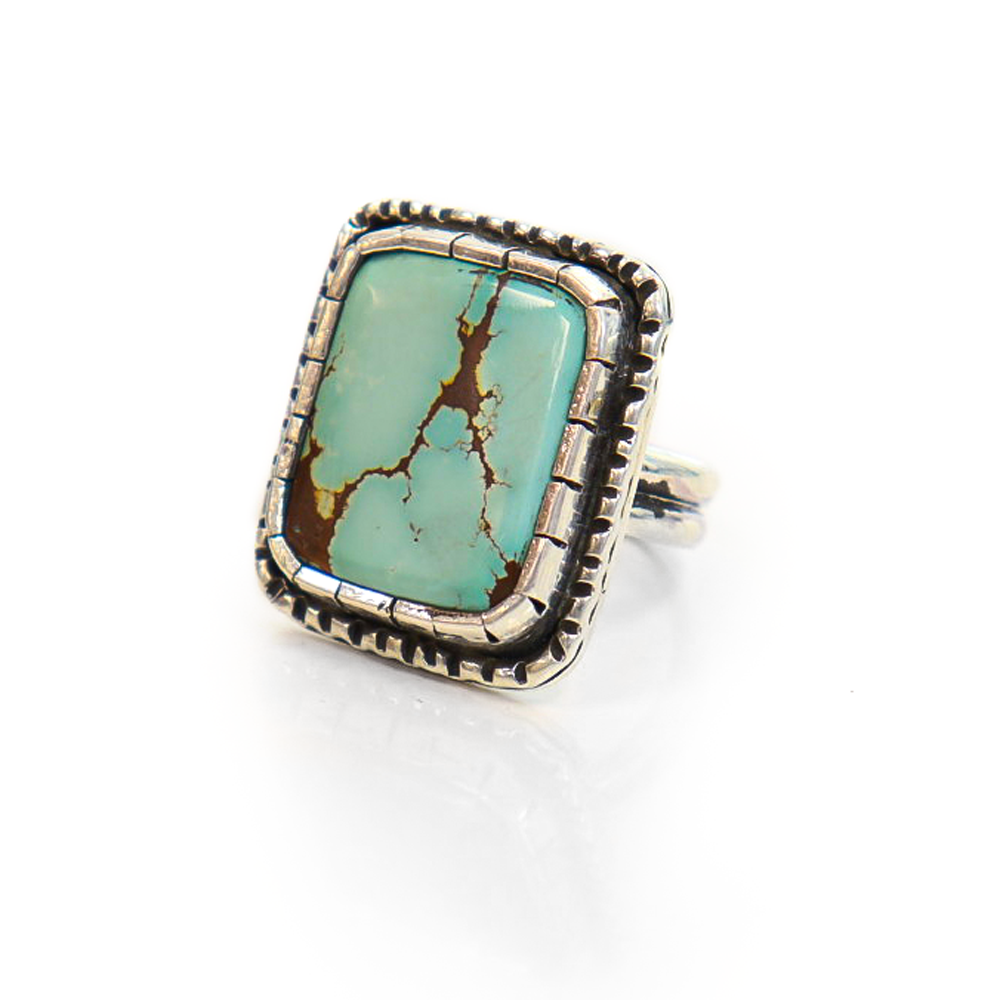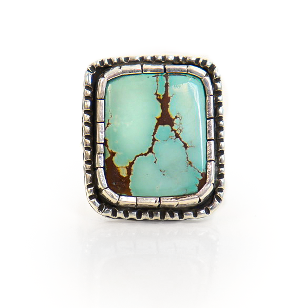 Castellated bezel set moon maiden turquoise ring with chisel textured frame - oxidized