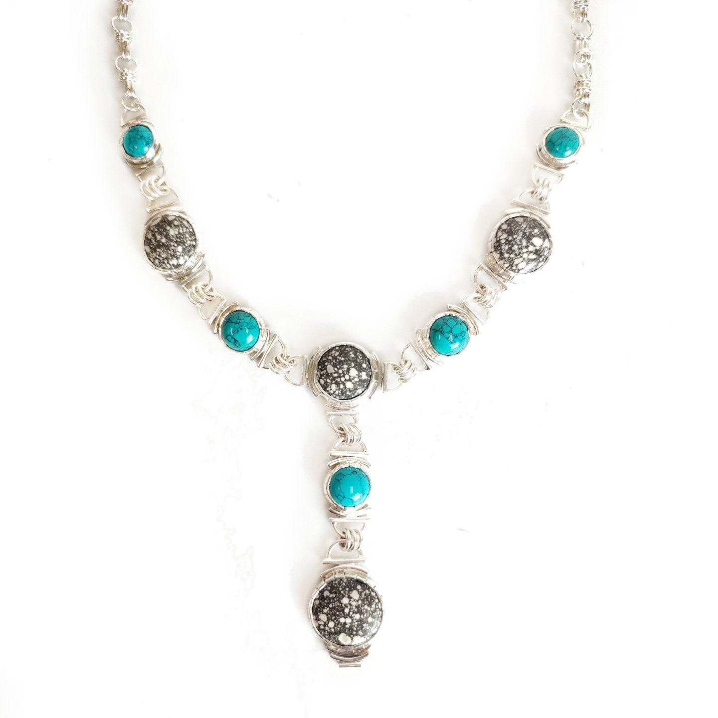 Sterling silver Lariat style necklace. Castellated bezel set Chinese spider vein turquoise & Appaloosa Stone (Wild Horse Magnesite from AZ).