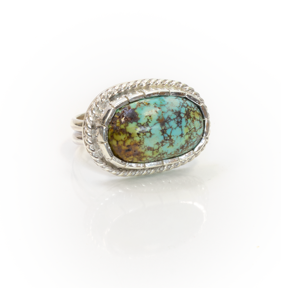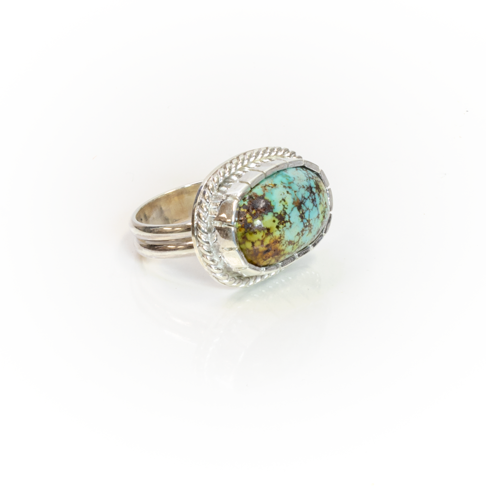 Castellated bezel set east/west orientation cloud mountain Hubei turquoise, sterling with twist wire frame ring