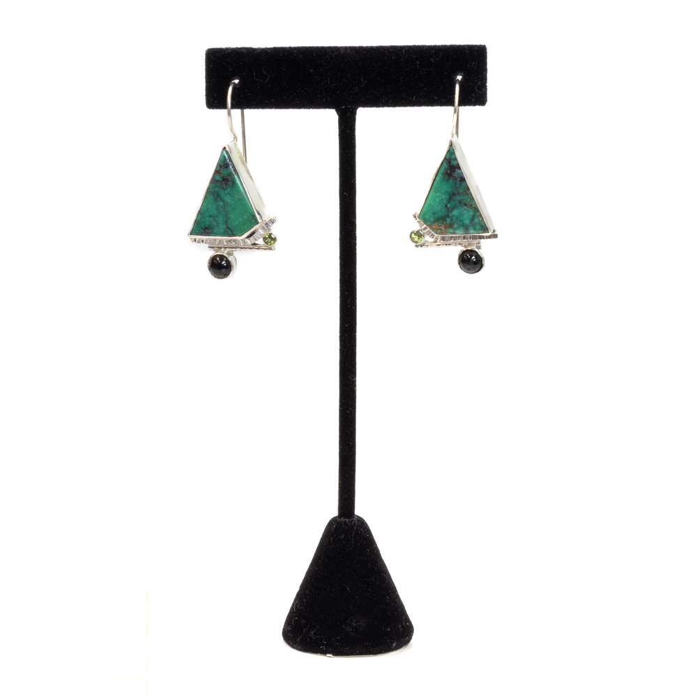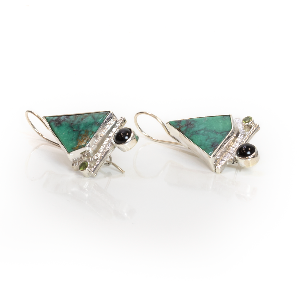 Sterling silver, old stock kingman turquoise accented with black onyx cabs, tube set peridot, locking earwires