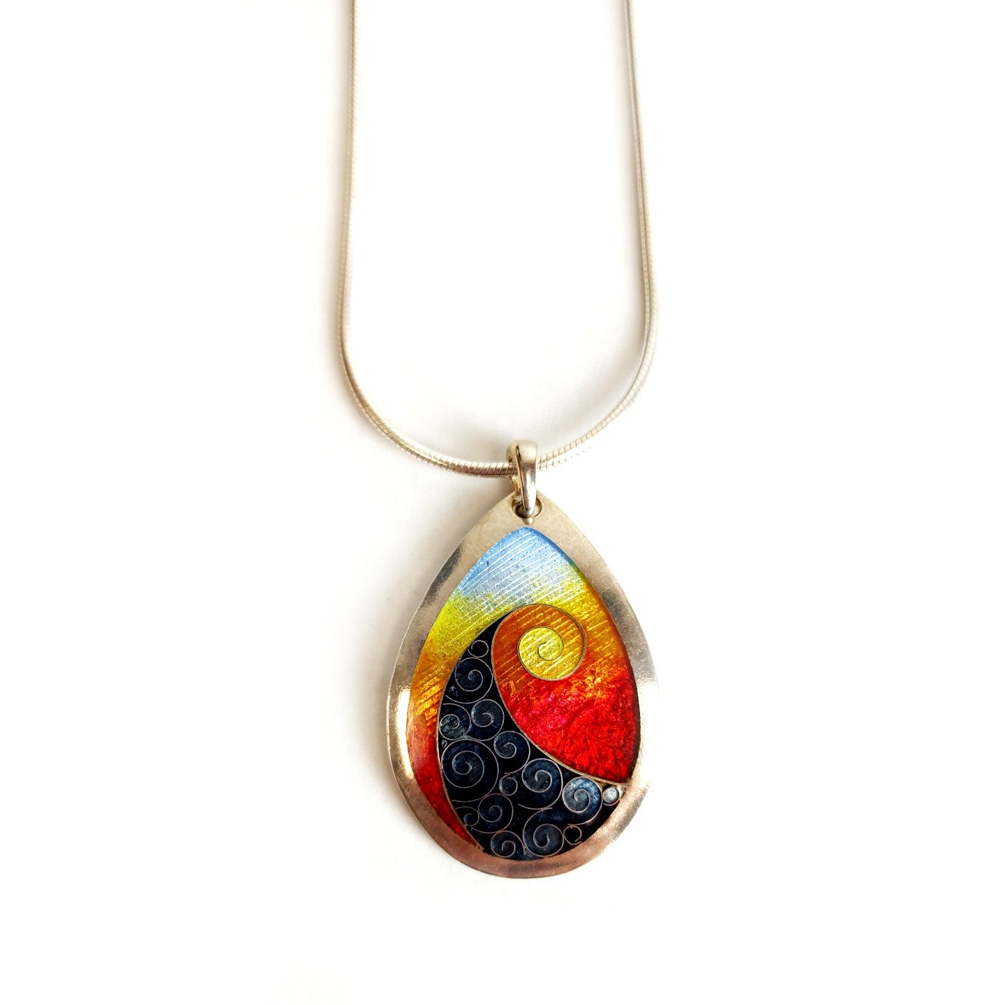 Rainbow Wave Pendant handcrafted champleve enamel by Exhibiting Artist in Jewelry, Sandra McEwen.
