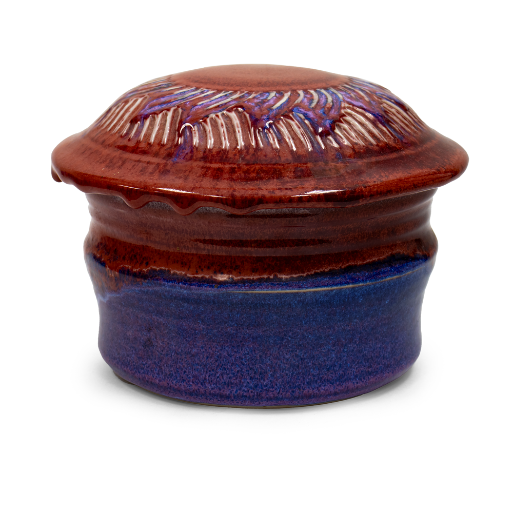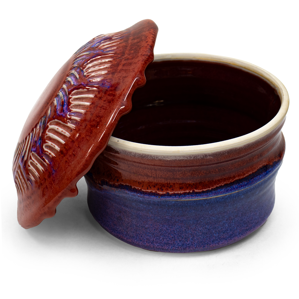 Red/Blue Clyde Gobble Covered Server. 5.5"H x 7.5"across.