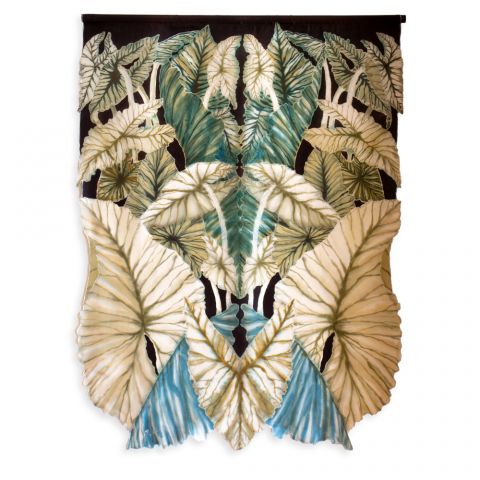 Margaret Agner does a complex form of silk painting she developed in 1996. The textures she creates are close to nature yet form an abstracted version of whatever species she is portraying. Her initial loose underpainting dictates and inspires the rest of the composition and layers. The subsequent layers of dying, steaming, painting, resist drawings and outline painting can take over a week between curing and drying. Most of her images are floral, but she is also working on a series of butterflies and moths. She makes art, like Mondrian, from “inner necessity.”
