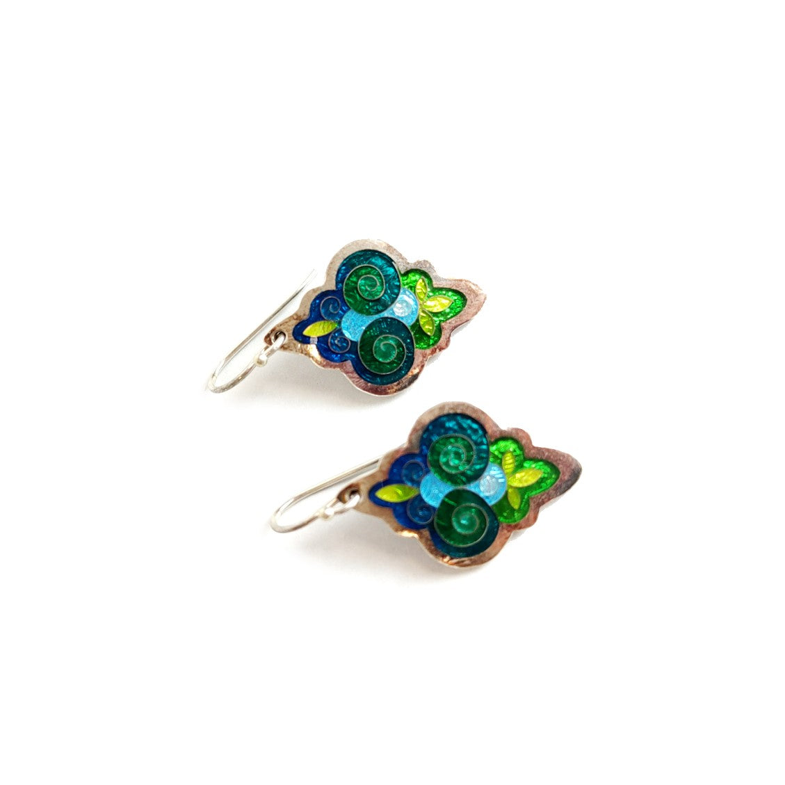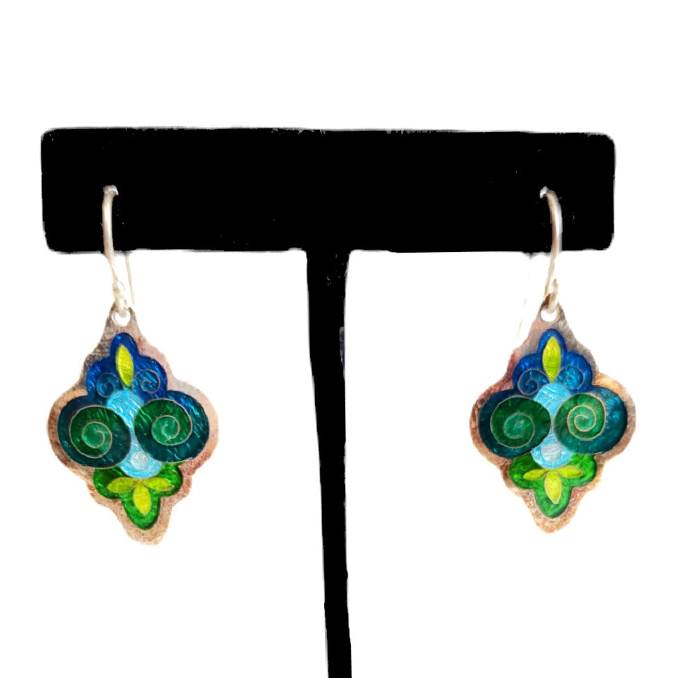 Teal Baroque Earrings handcrafted champleve enamel by Exhibiting Artist in Jewelry, Sandra McEwen.