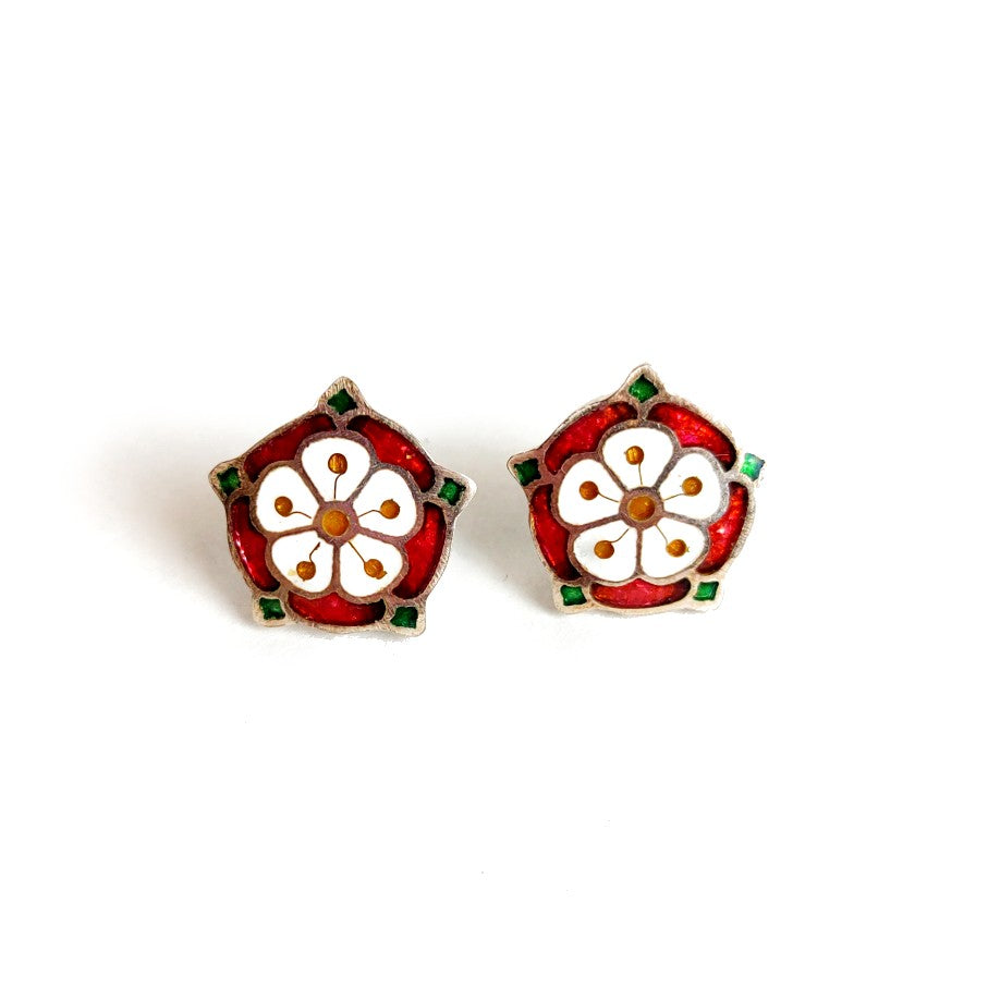Tudor Rose Post Earrings handcrafted champleve enamel by Exhibiting Artist in Jewelry, Sandra McEwen.