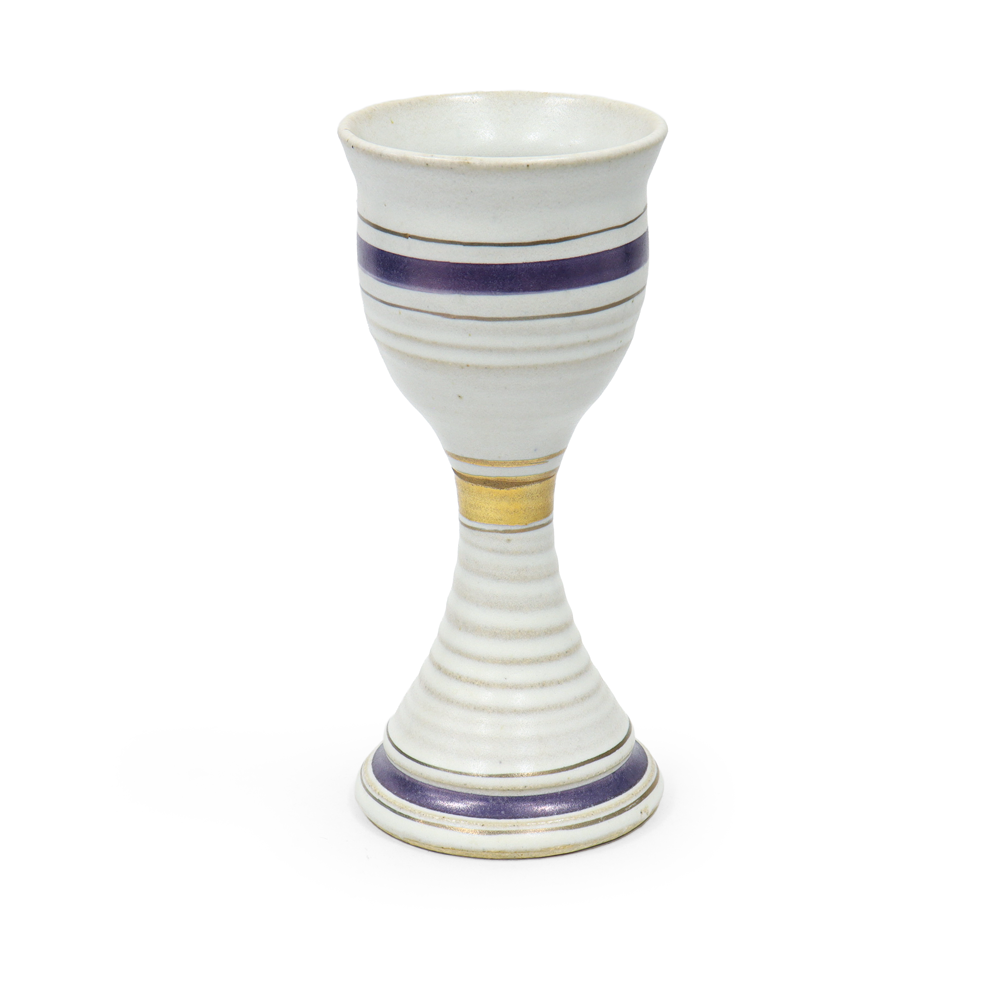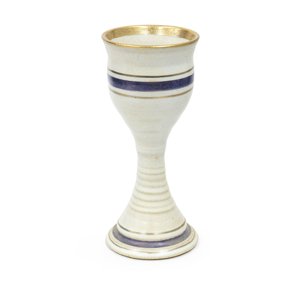 Goblets by In Memoriam Artist in Clay, Clyde Gobble. White with blue & gold accents. each are 8"H x 3"W