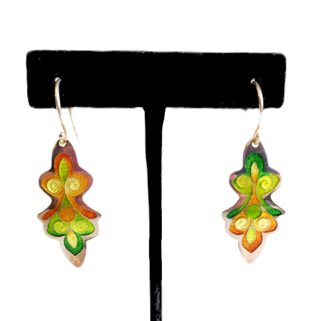 Yellow & Green Artemis Earrings handcrafted champleve enamel by Exhibiting Artist in Jewelry, Sandra McEwen.